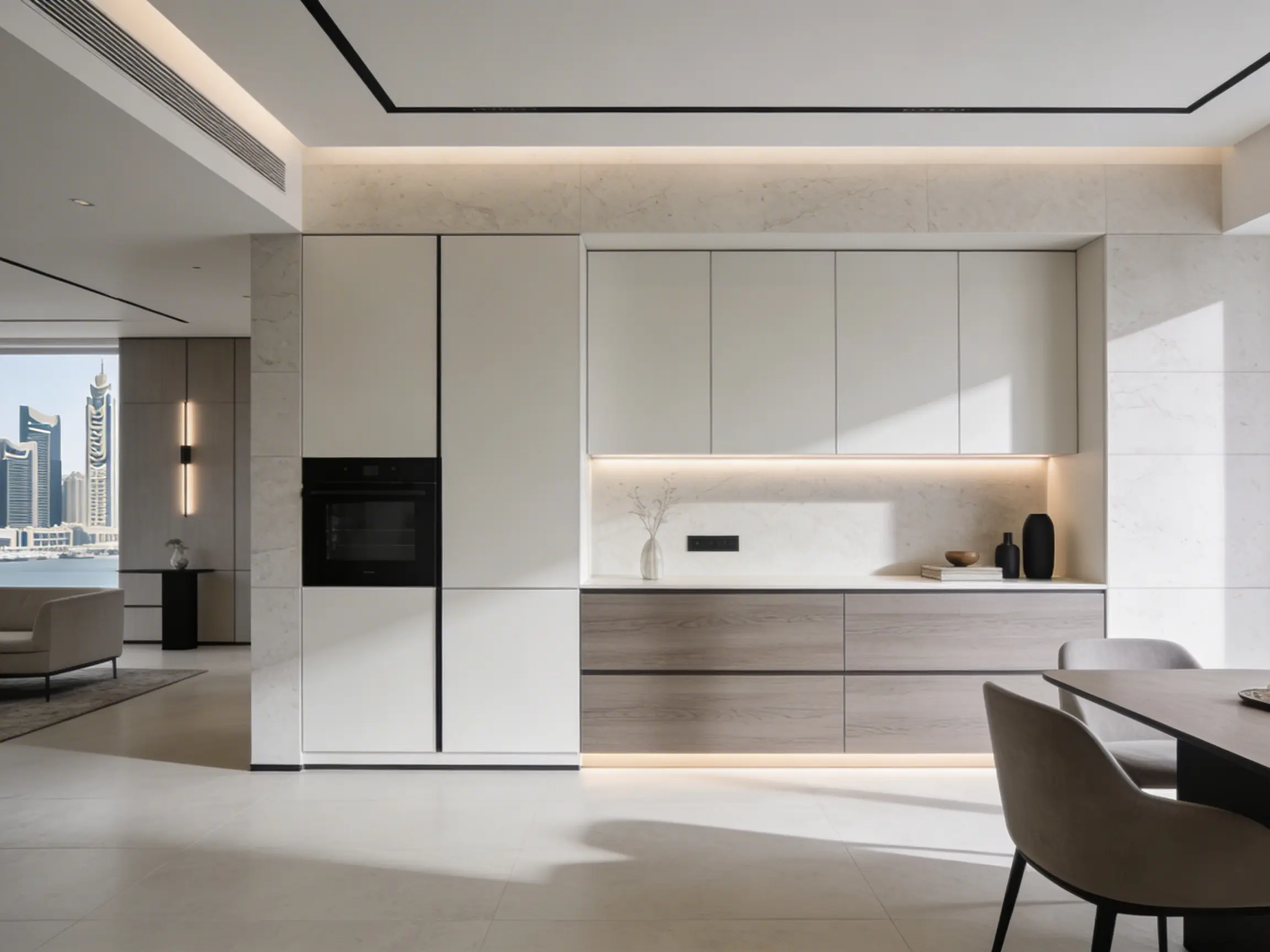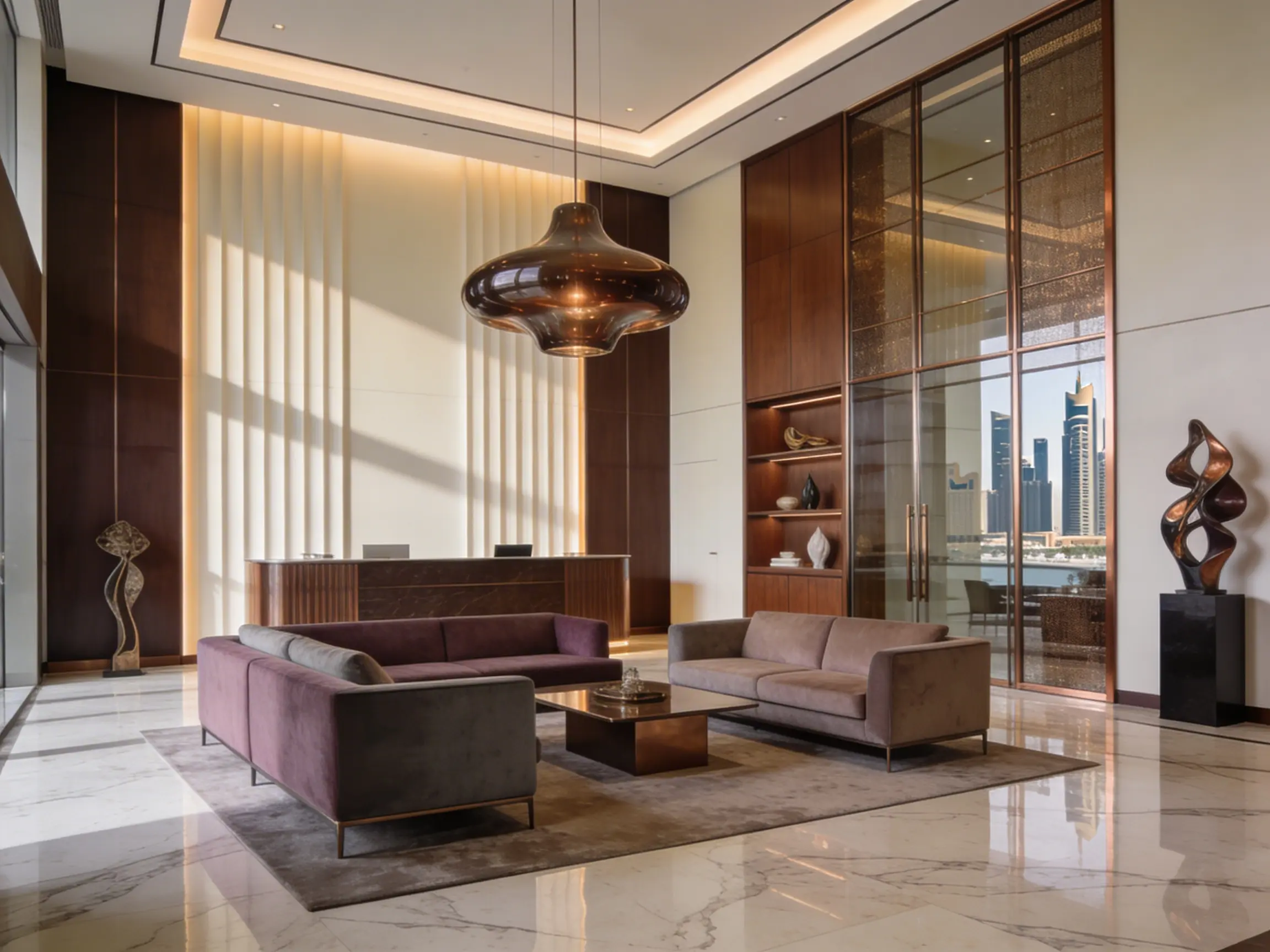 Luxury interior design in Business Bay often blends current design trends with high-end finishes and a warm, inviting quality. This style balances glamour and comfort in a way that feels current rather than overdone. It is a popular choice for client-facing spaces and executive suites.