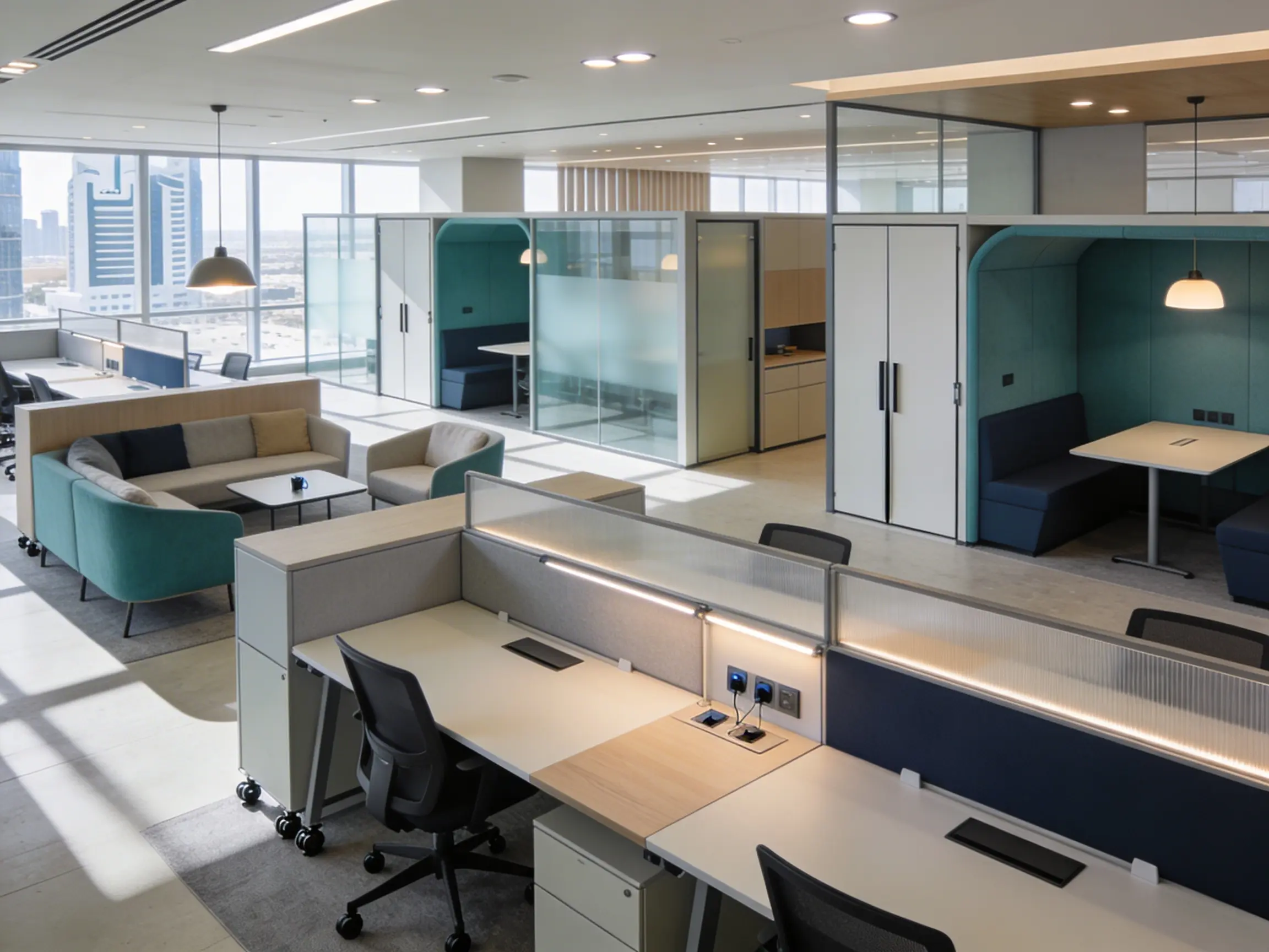 The modern work environment demands flexibility. Hybrid workspace design incorporates areas for collaboration, quiet focus, casual meetings, and social interaction all within one thoughtfully considered layout. This is increasingly the style of choice for forward-thinking companies across the UAE.