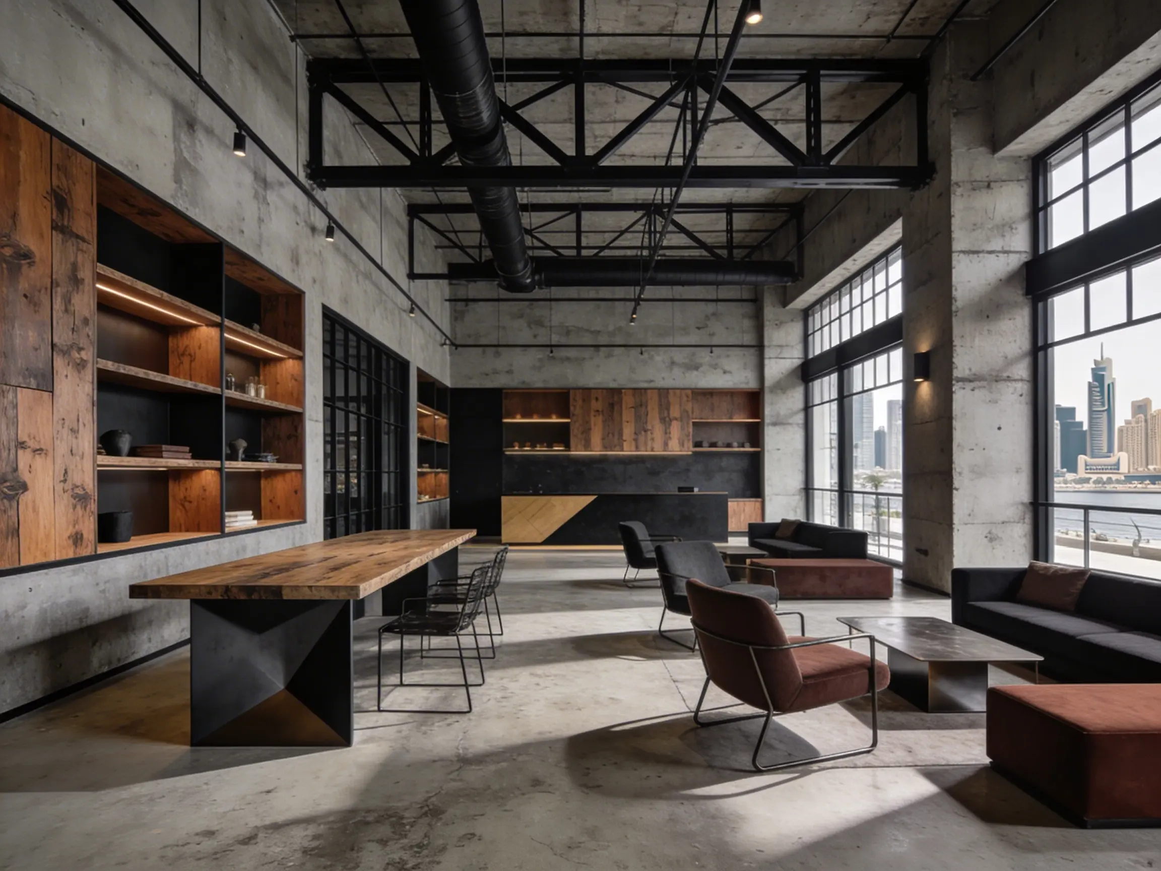 Raw textures, exposed elements, and a bold use of contrast define this style. It works well for creative businesses, tech companies, and brands that want their space to feel authentic, edgy, and full of character. Done well, it can be just as refined as any other high-end aesthetic.