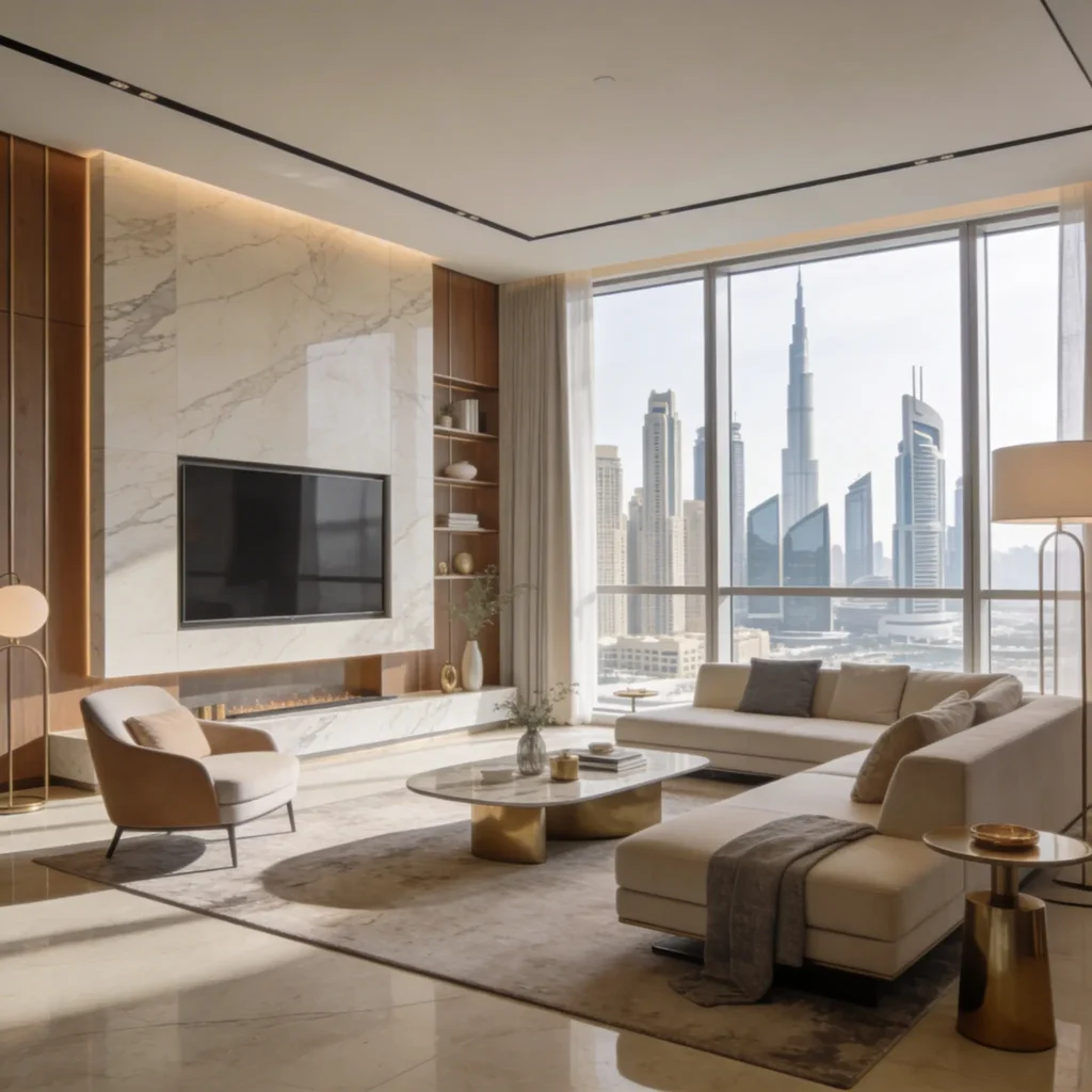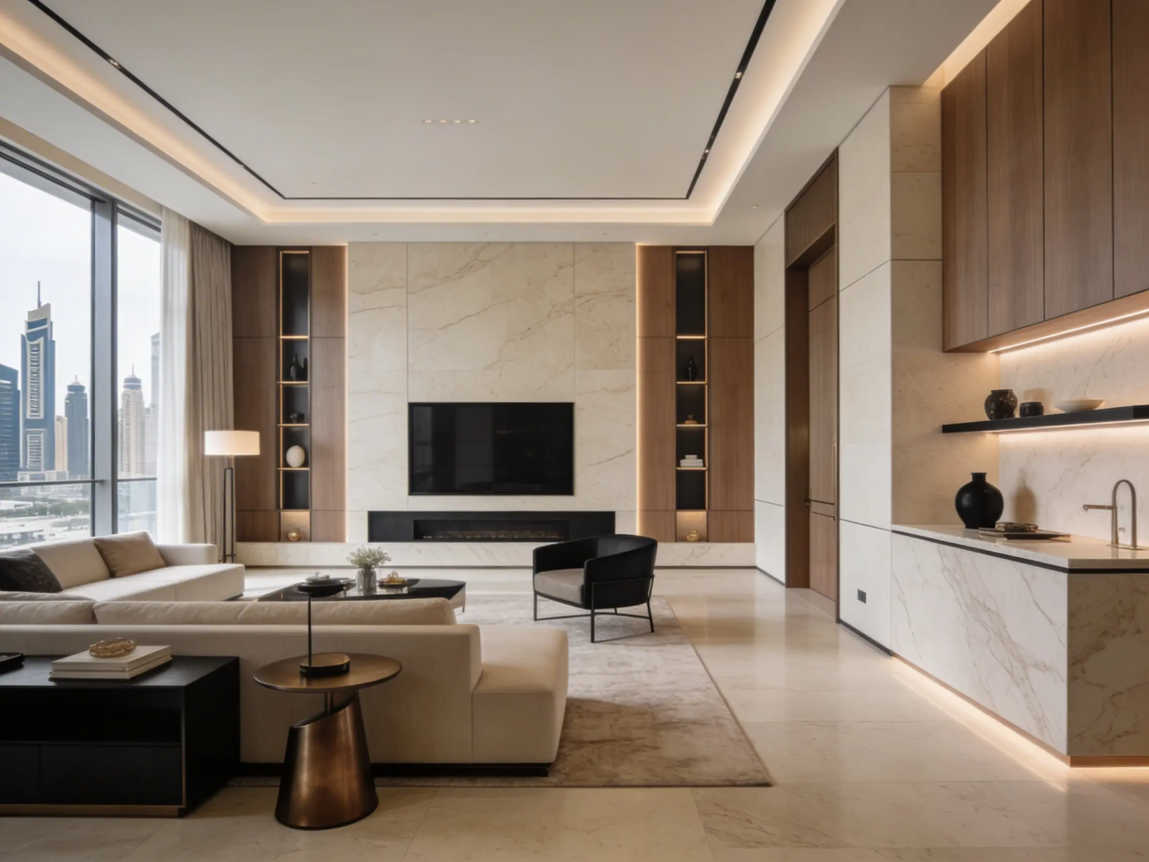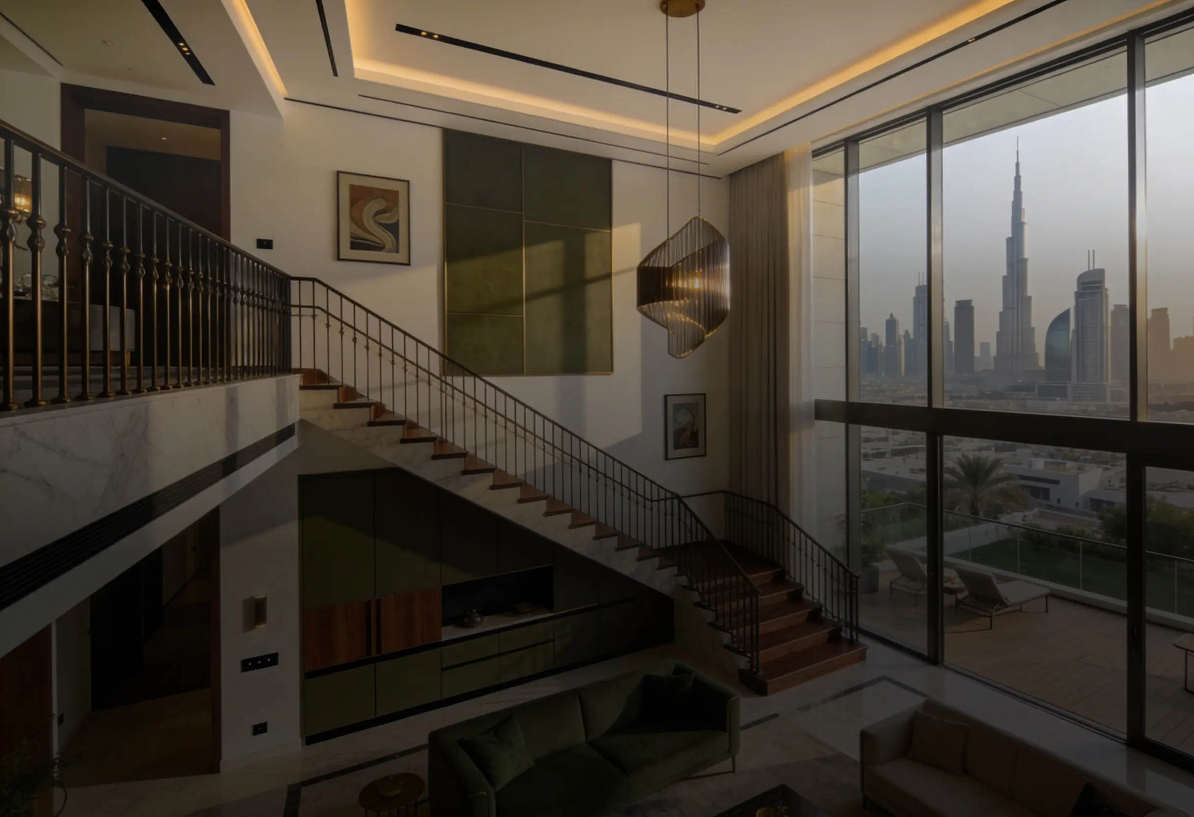• Penthouse interior design Dubai with bespoke layouts, statement features, and premium material finishes