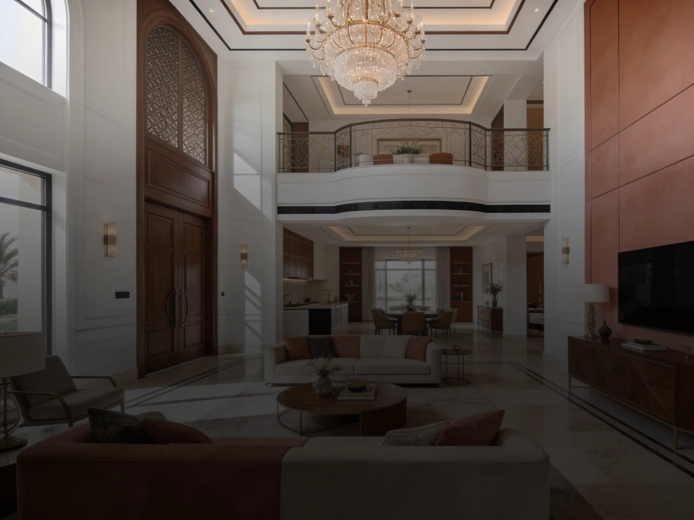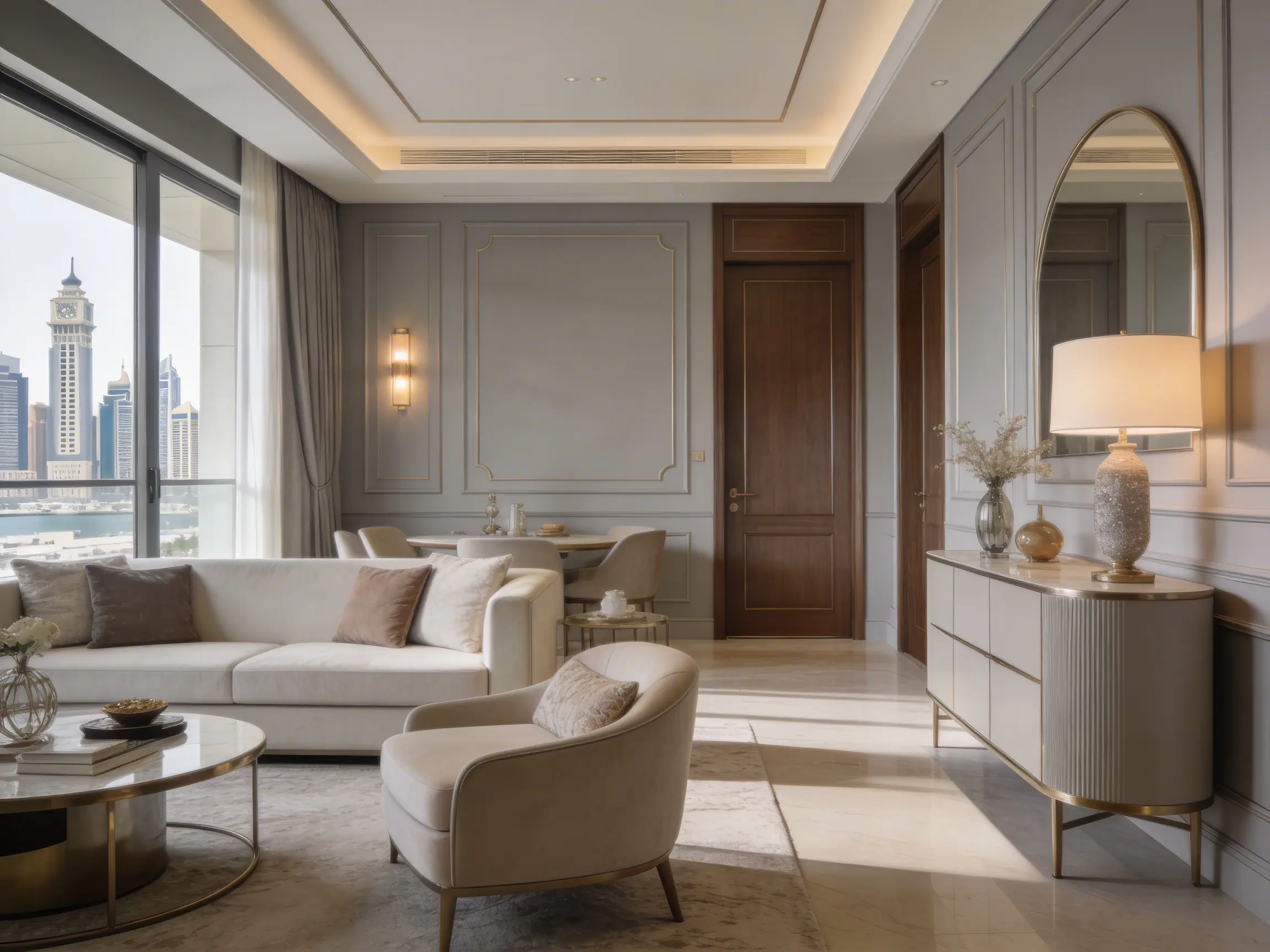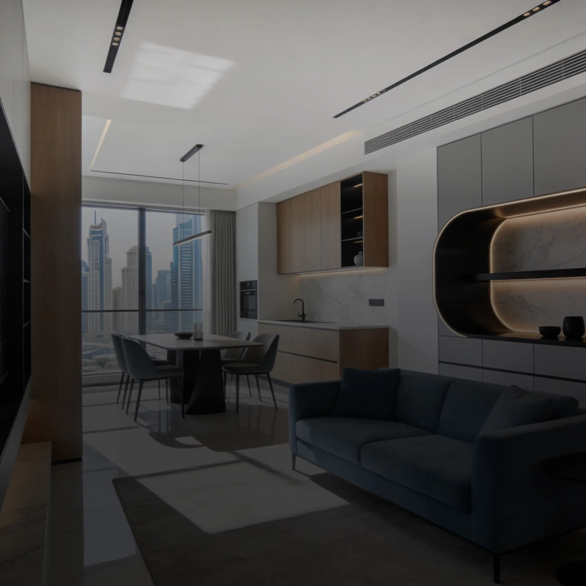 • Penthouse interior design Dubai with bespoke layouts, statement features, and premium material finishes