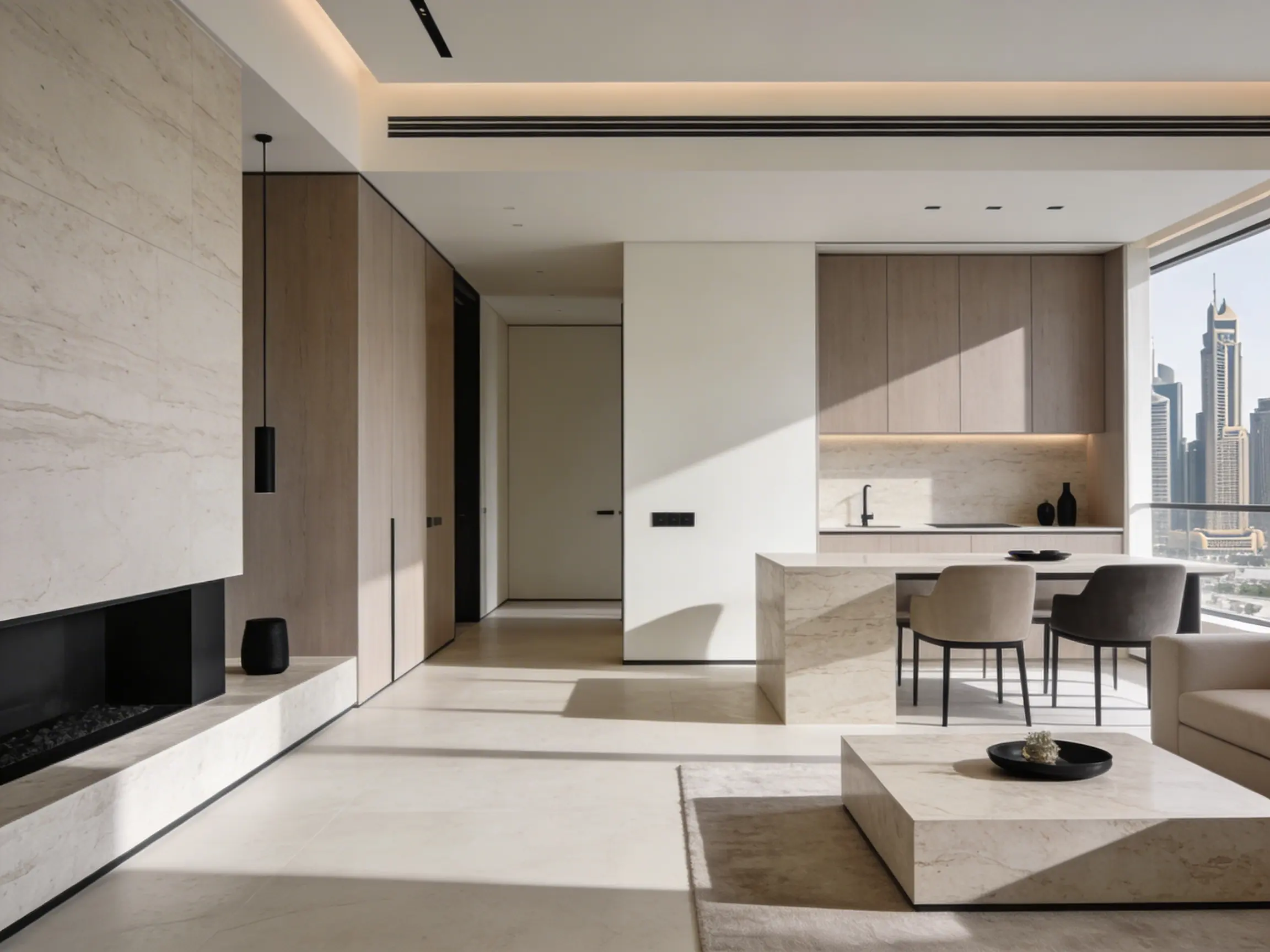 Minimalist interiors in Downtown Dubai still feel genuinely luxurious because the quality of materials carries the weight. Natural stone, matte wood tones, carefully considered proportions, and a restrained color palette create spaces that feel both calm and considered.
