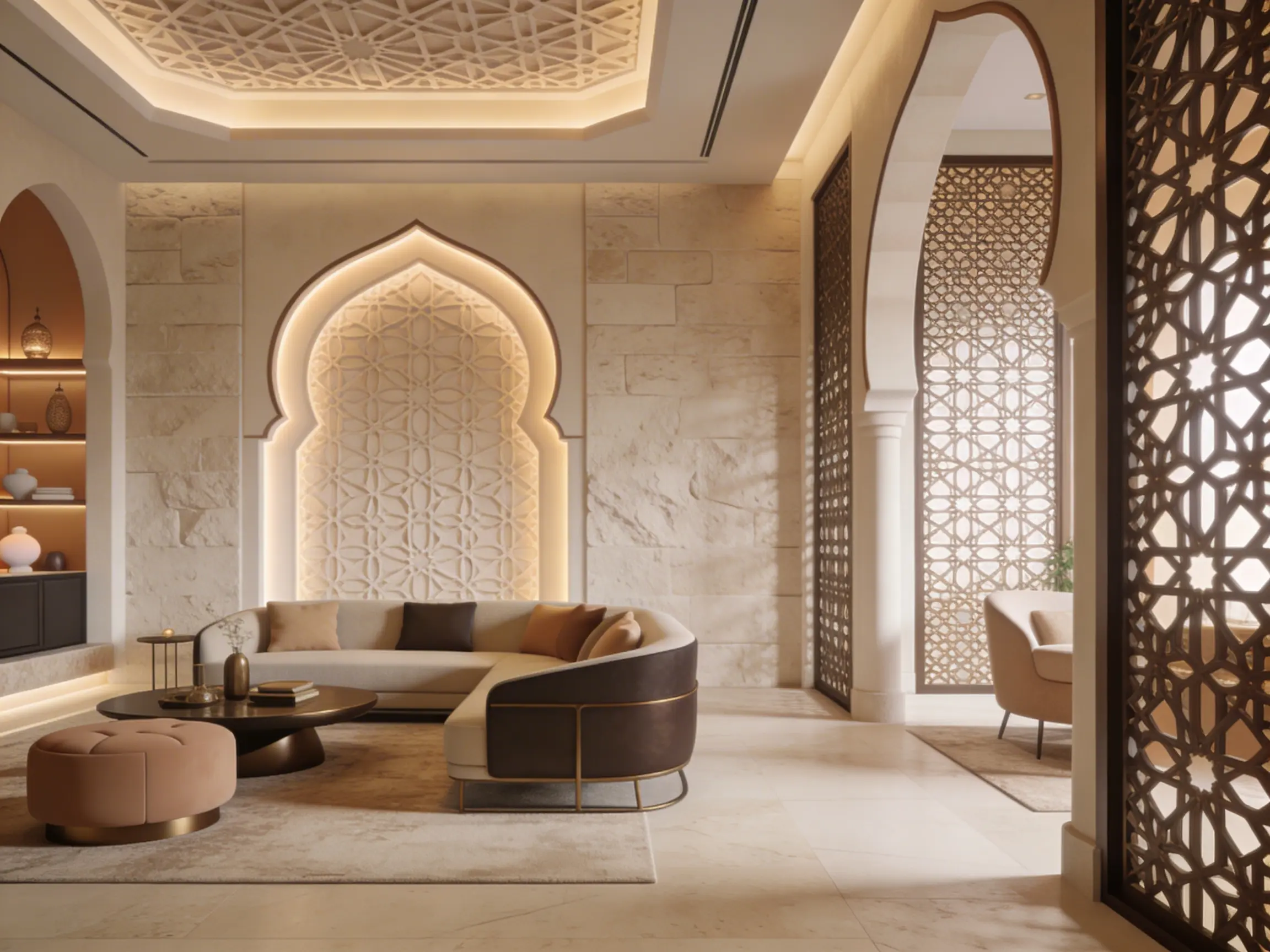 Modern Arabic fusion brings together the warmth and richness of traditional Emirati and Islamic design with a contemporary sensibility. Geometric patterns, arched features, mashrabiya-inspired details, and a palette drawn from the desert landscape sit alongside modern furniture and finishes with real sophistication.