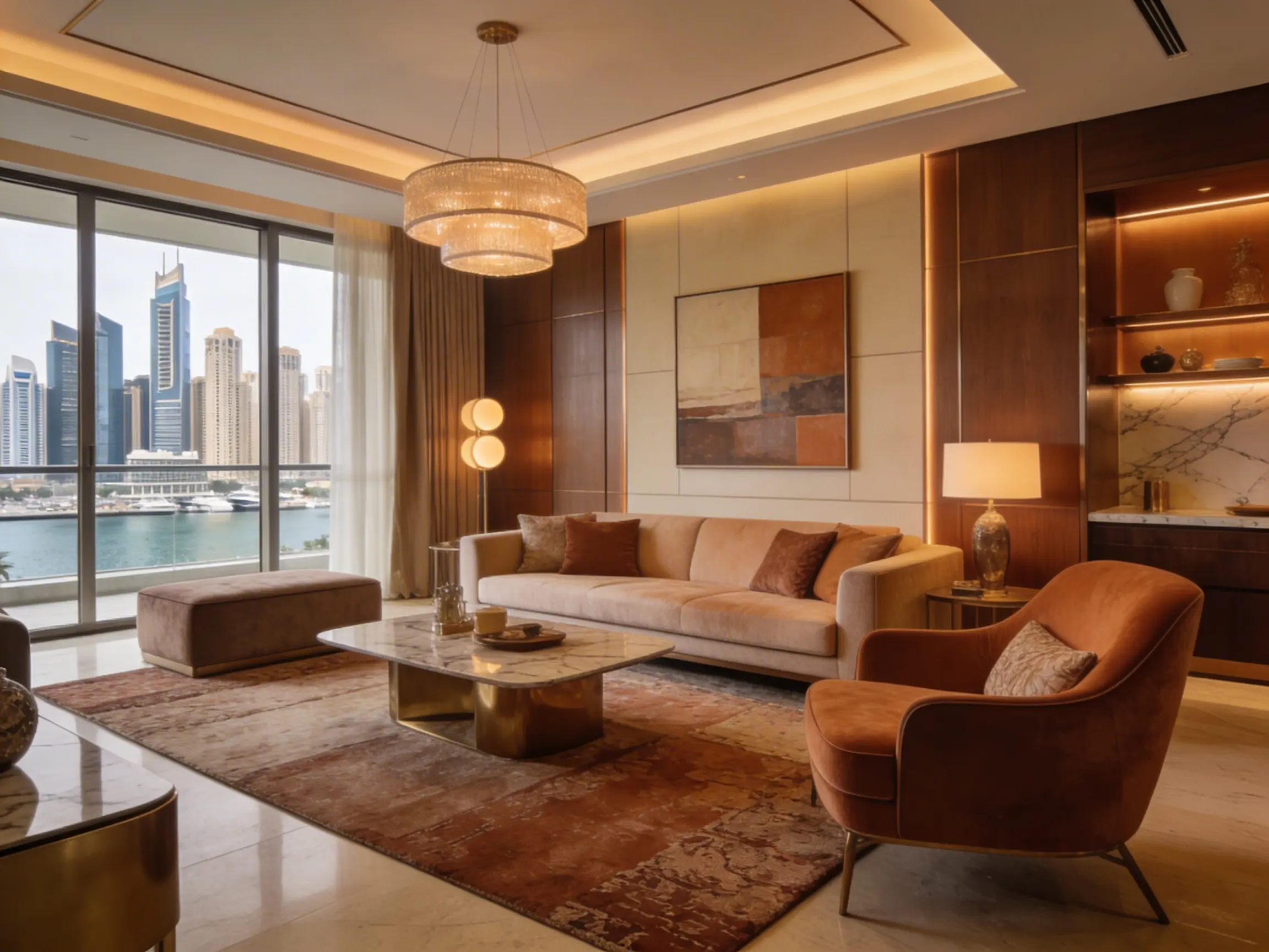 This style blends high-end finishes with a genuinely comfortable and inviting quality. Rich textures, layered lighting, and a careful selection of furniture and artwork come together to create homes that feel as good to live in as they look. This is one of the most requested styles in Dubai Marina for good reason.