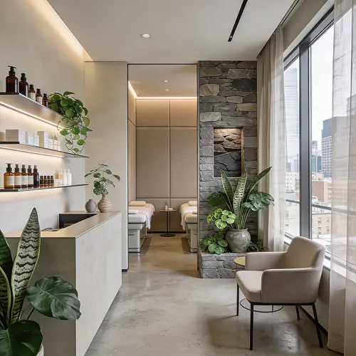 City locations serve clients seeking quick escapes from busy lives. Our designs reflect modern spa interior design trends, creating urban oases with efficient layouts maximizing limited space, soundproofing blocking city noise, natural elements contrasting urban environments, express treatment room options, retail areas for take home products, and designs supporting high client turnover.