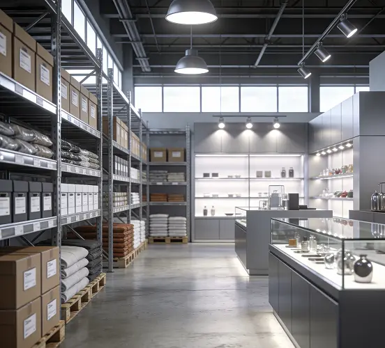 Facilities that combine storage with customer-facing display areas. Common for building materials, furniture, automotive parts, and wholesale operations. These require careful zoning, an impressive front-of-house, an efficient back-of-house, and smooth transitions between the two.